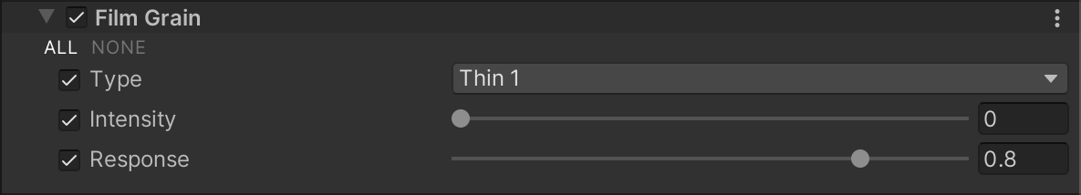 _Scene with Film Grain effect turned on._ The Film Grain effect simulates the random optical texture of photographic film, usually caused by small particles being present on the physical film. ## Using Film Grain **Film Grain** uses the [Volume](Volumes.md) framework, so to enable and modify **Film Grain** properties, you must add a **Film Grain** override to a [Volume](Volumes.md) in your Scene. To add **Film Grain** to a Volume: 1. In the Scene or Hierarchy view, select a GameObject that contains a Volume component to view it in the Inspector. 2. In the Inspector, navigate to **Add Override > Post-processing** and click on **Film Grain**. URP now applies **Film Grain** to any Camera this Volume affects. ## Properties ![](Images/Inspectors/FilmGrain.png) | **Property** | **Description** | | ------------- | ------------------------------------------------------------ | | **Type** | Use the drop-down to select the type of grain to use. You can select from a list of presets that URP includes, or select **Custom** to provide your own grain Texture. | | **Texture** | Assign a Texture that this effect uses as a custom grain Texture.This property is only available when **Type** is set to **Custom**. | | **Intensity** | Use the slider to set the strength of the Film Grain effect. | | **Response** | Use the slider to set the noisiness response curve. The higher you set this value, the less noise there is in brighter areas. ![Film Grain Response](Images/post-proc/film-grain-response.png)