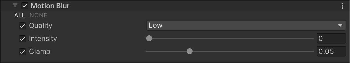 | Intensity | Set the strength of the motion blur filter to a value from 0 to 1. Higher values give a stronger blur effect, but can cause lower performance, depending on the Clamp parameter. |