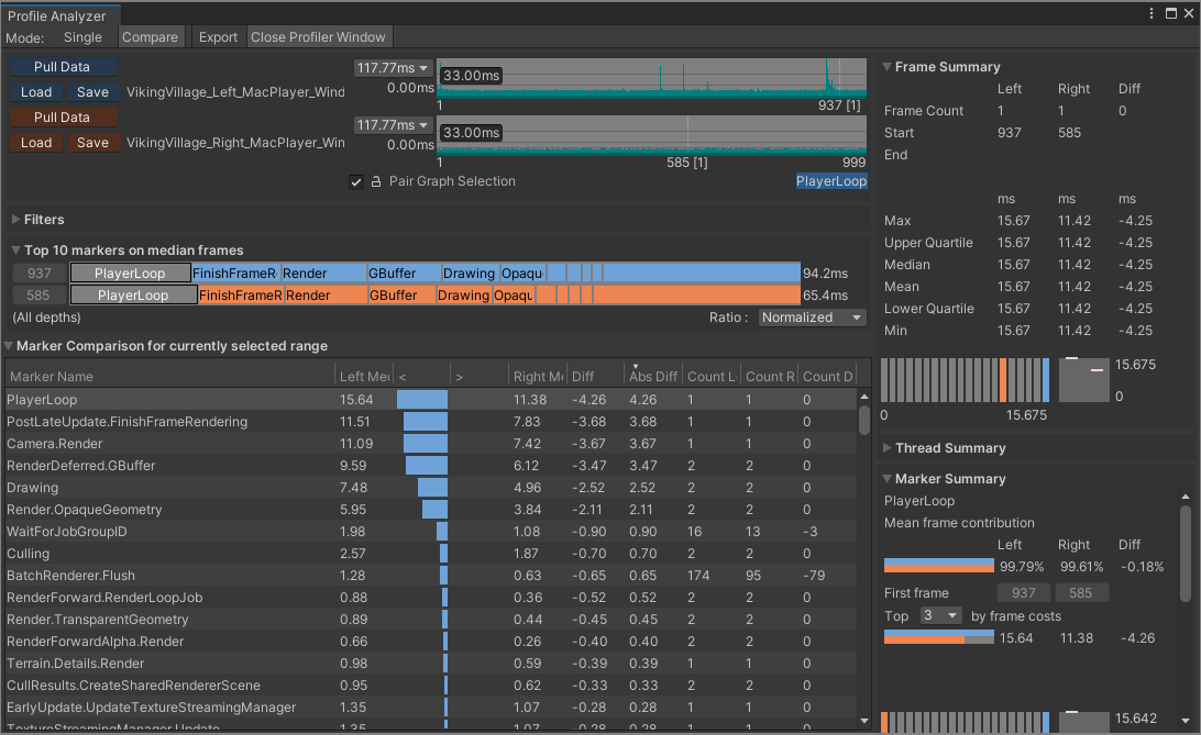 1. Open the Profile Analyzer window (menu: Window > Analysis > Profile Analyzer). Click the Compare button in the toolbar to enter the Compare view.