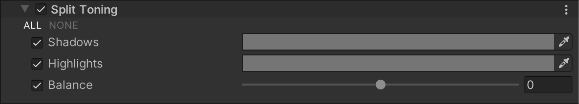 Split Toning uses the Volume framework, so to enable and modify Split Toning properties, you must add a Split Toning override to a Volume in your Scene. To add Split Toning to a Volume: